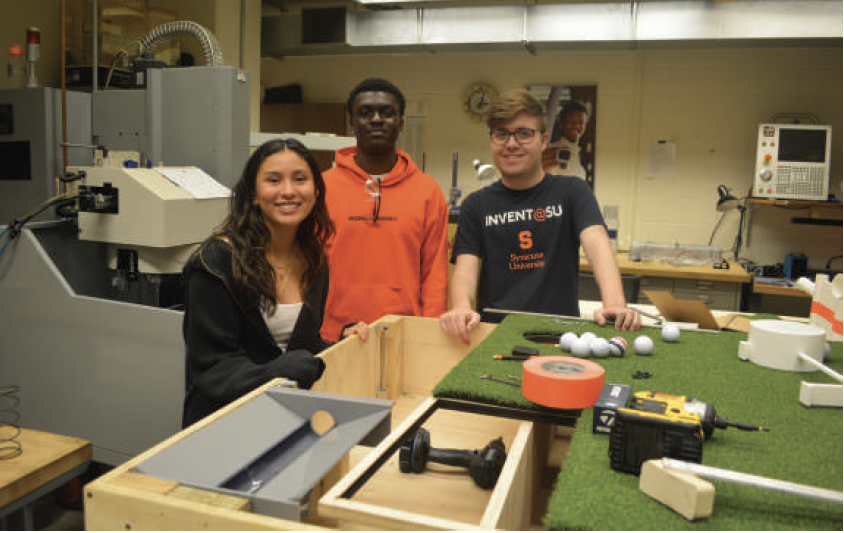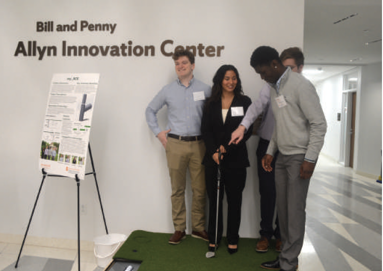 Project Summary: replACE allows the player to tee a new golf ball without having to bend over, helping those with limited mobility to continue playing the sport they love. By eliminating golf players’ need to bend over, replACE allows older and less mobile players to play without causing stress on their back. It works with the simple press of a pedal, which lowers the tee and allows a golf ball to be fed onto it. When the pedal is released, the tee rises back up with the new golf ball ready to go. The mechanism is purely mechanical, utilizing only pulleys, weights, and springs to accomplish the task. replACE’s advantage is that it does not require any electricity to function. Its simplistic design makes repairs effortless. There is no need to run wires to the system, and it is environmentally friendly. And with relatively low manufacturing costs, the price point of the final product will be affordable for a wide range of consumers.